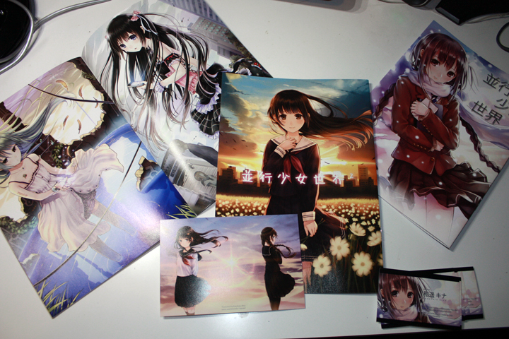右下にあるのが名刺で、新刊の上にのっかってるのがおまけにつけるポストカードです!