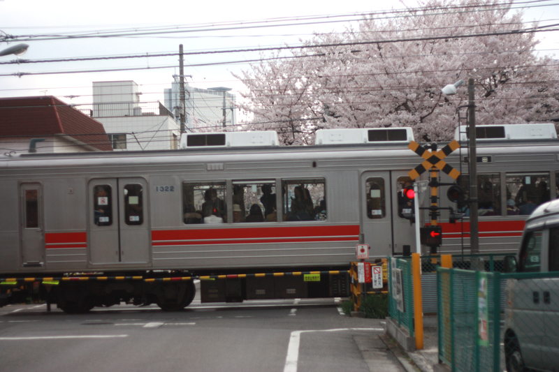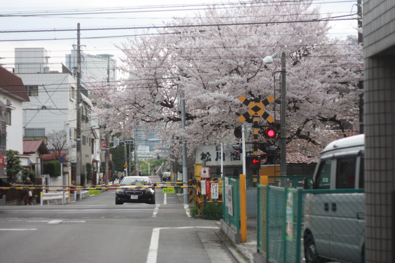 踏切、桜、電線と
